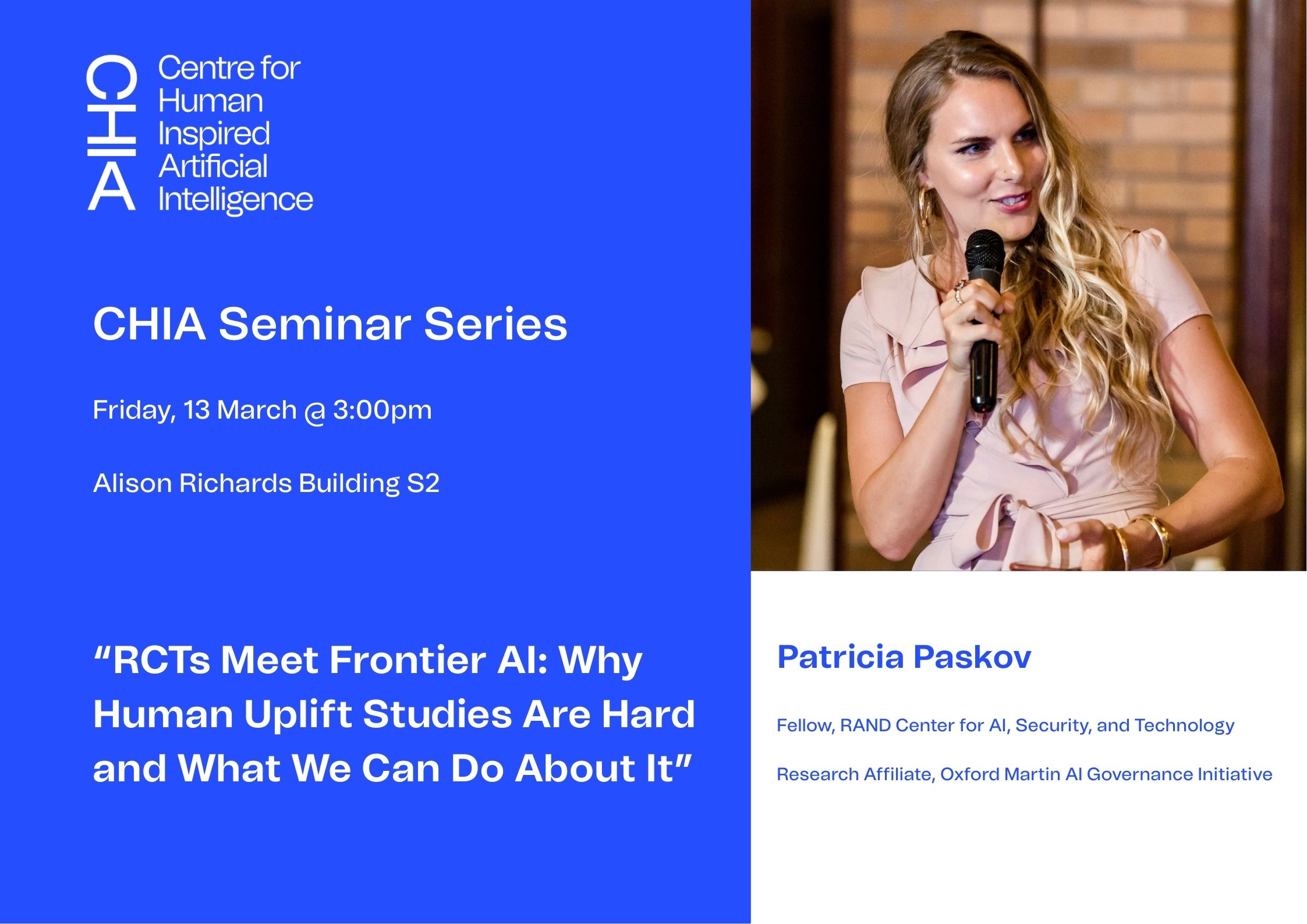 CHIA will be hosting Patricia Paskov on Friday, 13 March at 3:00pm in ARB S2 for a talk titled, “RCTs Meet Frontier AI: Why Human Uplift Studies Are Hard and What We Can Do About It.” Patricia is a Fellow at the RAND Centre for AI, Security, and Technology, and a Research Affiliate at the Oxford Martin AI Governance Initiative.