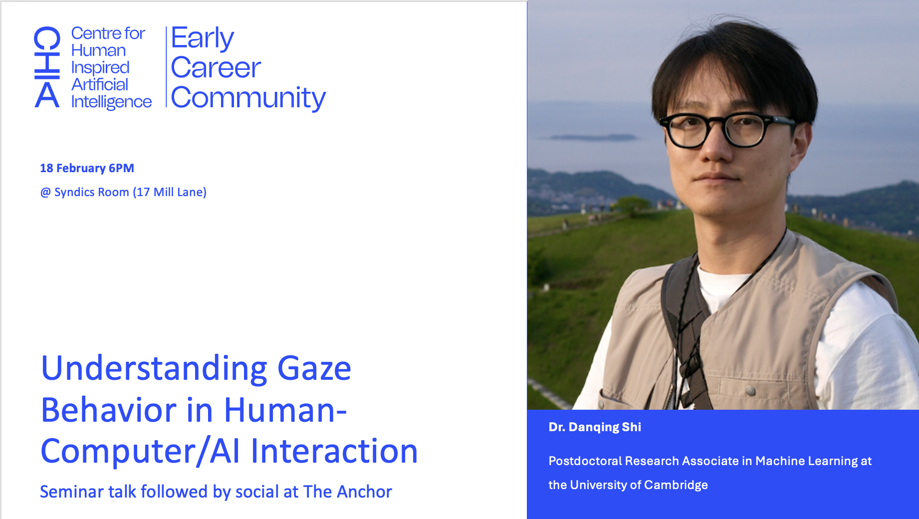 Dr Danqing Shi, a postdoctoral research associate in machine learning at the University of Cambridge, will give a talk about gaze behaviour in human-computer/AI interaction.